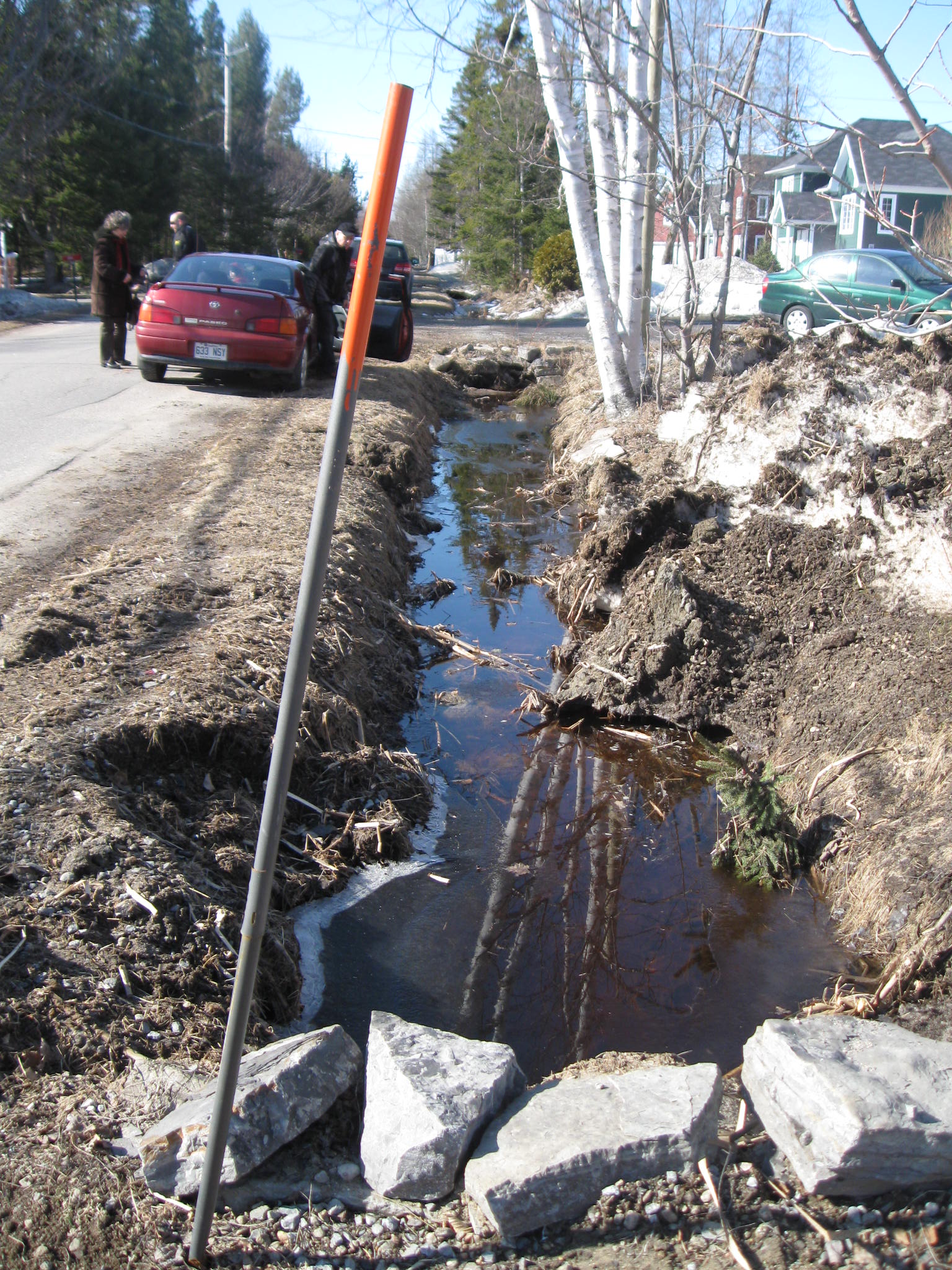 De plus, il y a un peu plus d’une semaine, des travaux ont été faits dans un segment de fossé de la rue des Épinettes-Rouges afin de régler un problème d’inondation chez des citoyens. Suite à ces travaux, la végétation recouvrant le talus de chaque côté du fossé se détache et tombe au fond du fossé et des amoncellements de tourbe, de terre et de gravier bouchent de plus en plus les tuyaux d’écoulement.